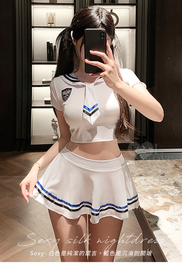 學生角色扮演服!純白大方水手領露腰短版上衣 × 條紋短裙三件組