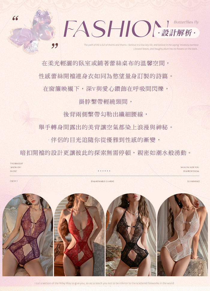 | 繁花似錦.深V愛心鑽飾露胸掛脖繫帶美背蕾絲開襠連體衣【黑色】