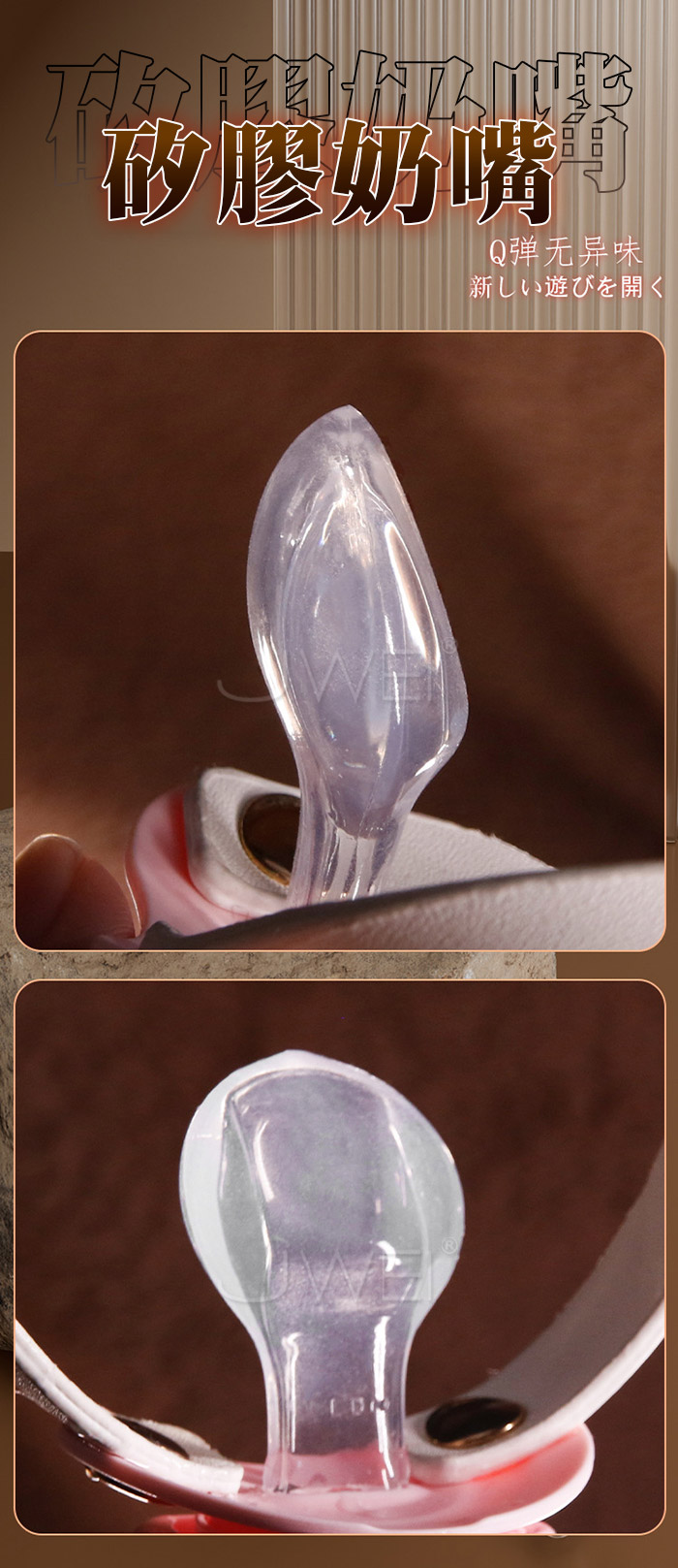 情侶玩具 羞恥調教 奶嘴口塞乳夾 口水流垂 奶嘴設計矽膠材質的奶嘴Q彈耐用軟萌可愛 乳夾鈴鐺隨著身體擺動而循序漸進,乳此動聽 產品規格 ■尺寸:大小詳如圖片標示 ■材質:皮革+合金+矽奶嘴 ■特色:增進情趣 ■SM用品屬於特殊情趣用品,需在雙方清醒自願的情況下使用,該物品僅作為情趣用品使用,使用時應注意安全!!