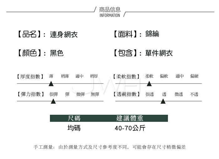 ■內容物:單件網衣 ■適穿尺寸:FREESIZE ■彈性:有 ■未撐開平量尺寸正負誤差1~2cm,1吋=2.54cm ■注意事項:基於保障消費者個人衛生,此貼身衣物恕不接受退換貨。 (如為商品本身暇疵,接受七日內換貨,請勿試穿,謝謝您)