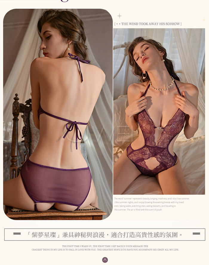 | 繁花似錦.深V愛心鑽飾露胸掛脖繫帶美背蕾絲開襠連體衣【紫色】