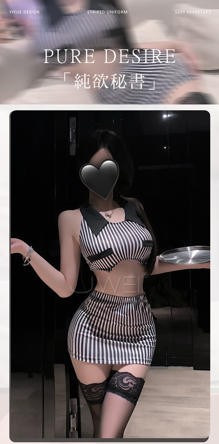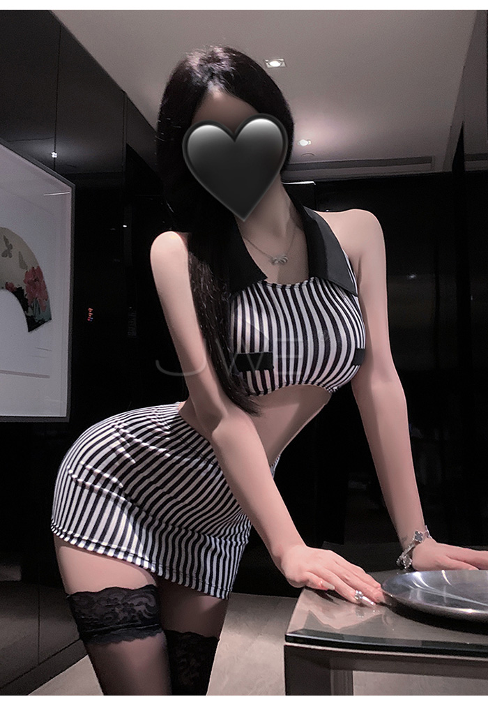 首頁>純欲秘書.條紋裹胸放大胸型露腰美背包臀秘書套裝【上衣+包臀裙+T褲】