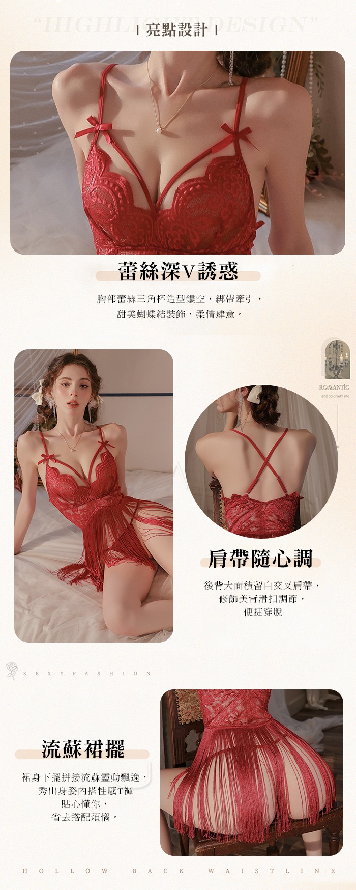 首頁>輕舞搖曳.網眼蕾絲深V誘惑流蘇裙襬露臀睡裙【睡裙+T褲】酒紅