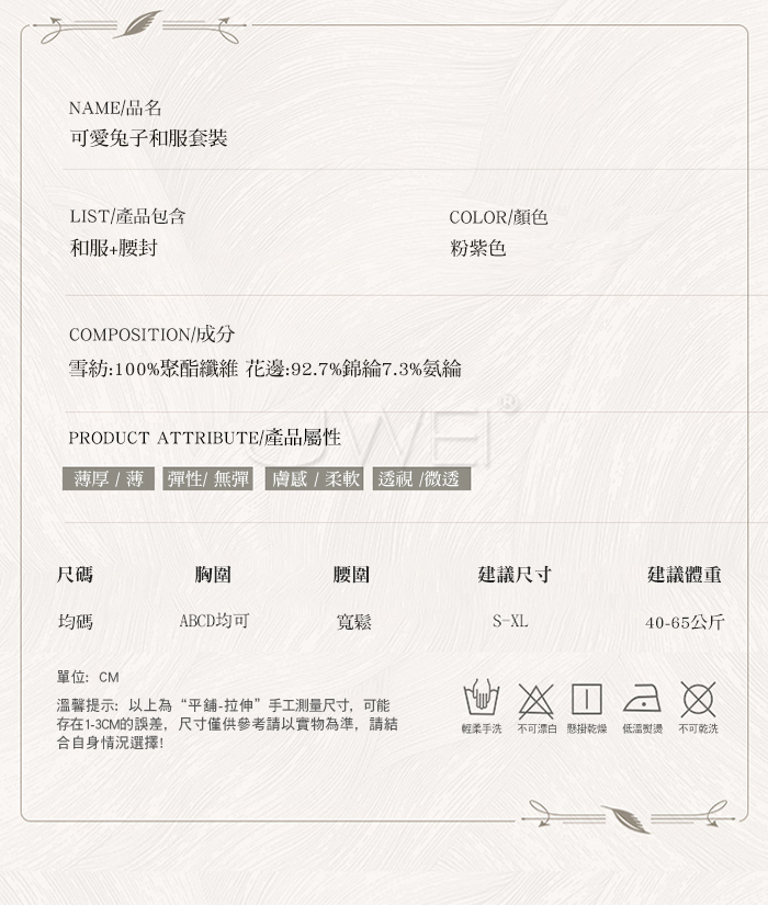 ■內容物:和服+腰封 ■適穿尺寸:FREESIZE ■彈性:無彈 ■未撐開平量尺寸正負誤差1~2cm,1吋=2.54cm ■注意事項:基於保障消費者個人衛生,此貼身衣物恕不接受退換貨。 (如為商品本身暇疵,接受七日內換貨,請勿試穿,謝謝您)