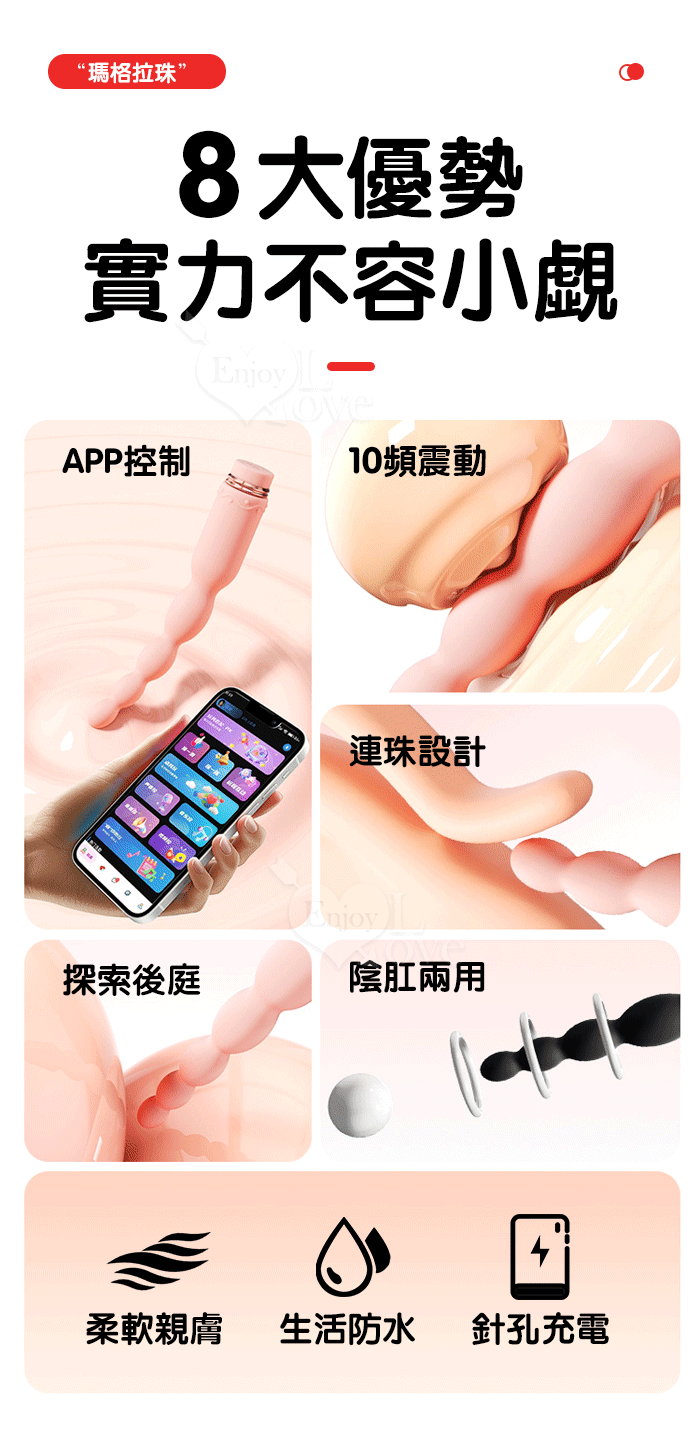 | ROSELEX 新手玩家 瑪格連環拉珠按摩棒~10頻強勁震動/細小易入/男女通用/可手機APP遙控﹝具兩種操控模式﹞粉