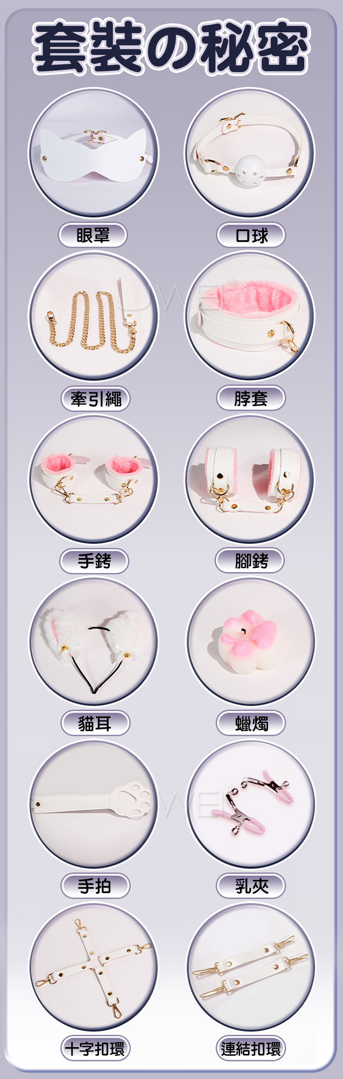 牽引繩、貓耳、蠟燭、手拍、乳夾、連結扣
